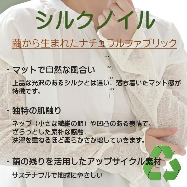 ※こちらの商品は、肌にやさしいを特長としており、糸や製品に特別な加工等を一切していません。素材の特性と天然素材(シルクノイル)は、毛玉や落ち綿現象が起きやすくなっております。予めご了承くださいませ。