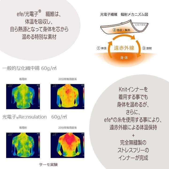 《efe エフェの特徴》 肌に一番近い素材として、心身をあたためることで、コンディションを整えます。 光電子®素材と同様に素材ごとに遠赤外線ふく射量を測定し、基準をクリアし認められたものが「efe エフェ」 となります。それにより質の高い休養を促し、身体のリカバリー・リラクゼーションをサポートします。着る人自身のコンディショニングを支えるヘルスケアマネージメントに繋がることが期待できます。