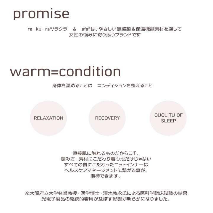 お勧め ポイント | ストレスフリーな毎日を過ごすために・・・直接肌に触れるものだから素材・編み方・サイズタグや洗濯表示タグなどのタグフリー、全てにこだわったニットインナー。 made in japan 「ra・ku・ra」